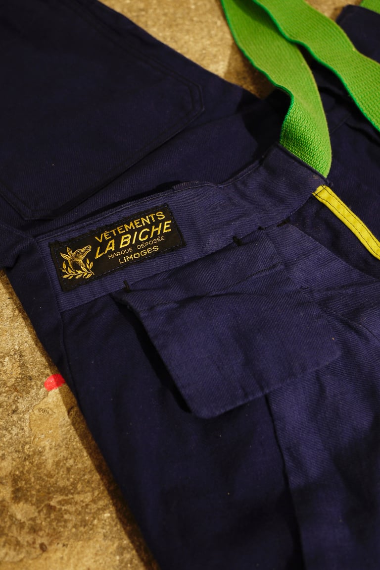 Pantalon travail bleu LABICHE "Made In Limoges (!)" / sangle verte / biais vert.